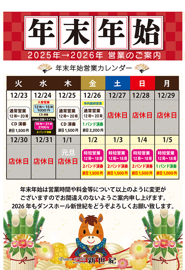 - ・1月2日(金)〜1月4日(日) 2バンド演奏